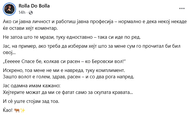 -Ако си јавна личност и работиш јавна професија – нормално е дека некој некаде ќе остави хејт коментар. Не затоа што те мрази, туку едноставно – така си иде по ред.