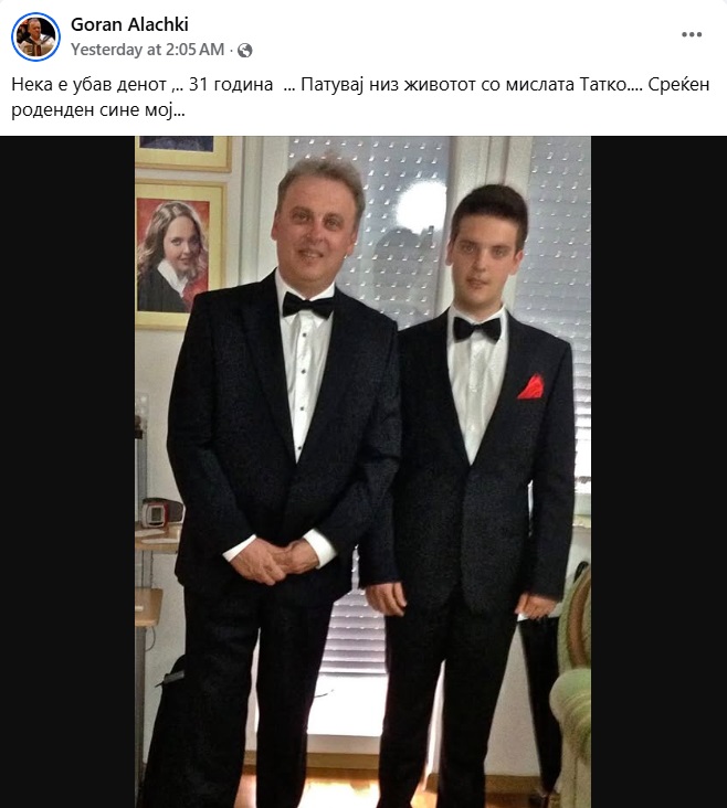 Емотивен статус на синот за роденденот, му посвети и татко му, познатиот музичар Горан Алачки: „Нека е убав денот ,.. 31 година … Патувај низ животот со мислата Татко…. Среќен роденден сине мој…“, напиша Горан Алачки.