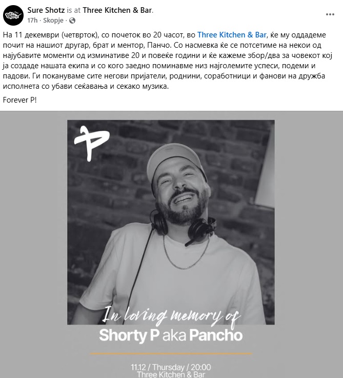 -На 11 декември (четврток), со почеток во 20 часот, во “Три кичен бар“ ќе му оддадеме почит на нашиот другар, брат и ментор, Панчо. Со насмевка ќе се потсетиме на некои од најубавите моменти од изминативе 20 и повеќе години и ќе кажеме збор/два за човекот кој ја создаде нашата екипа и со кого заедно поминавме низ најголемите успеси, подеми и падови.