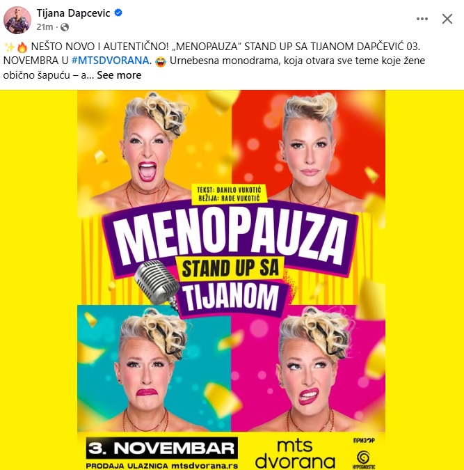 Имено, пејалката, актерка и музичарка се пофали со нешто сосема ново, а тоа е нејзинот стендап шоу. Шоуто се вика „Менопауза“ , и на 3 ноември ќе игра во Белград, каде што Тијана живее долги години со синот Вук и со сопругот Милан.