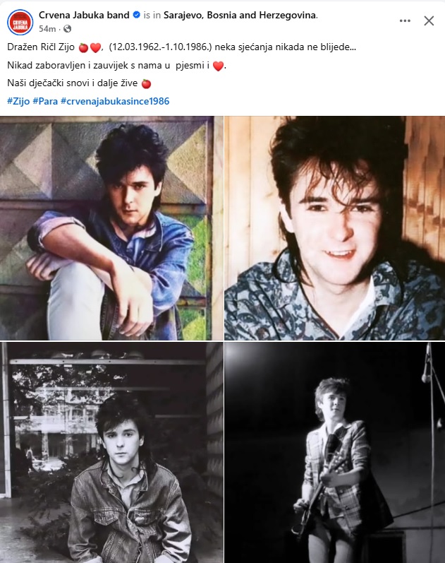 Груптата „Црвена јабука“ на официјалниот Фејсбук профил објави сеќавање на Дражен Ричл во кое пишува: Дражен Ричл Зијо (12.03.1962.-1.10.1986.) Спомените никогаш да не избледат.