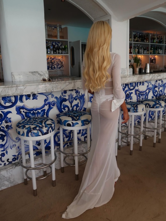 Глигоровска е во Шпанија, во Марбеља, а сликана е покрај продавницата на „Долче и Габана“ и во хотелот каде што е сместена. Маја е облечена во проѕирен бел фустан кој повеќе открива отколку што покрива, но секако одлично ѝ стои.