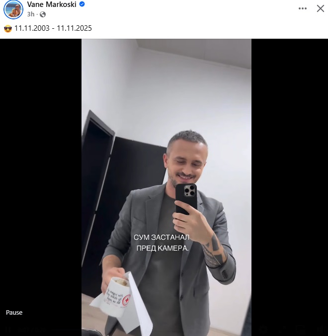 „Додека се подготвувв за емисија ова утро, се сетив дека на денешен ден во 2003 за првпат сум застанал пред камера. Еве сме и денеска, нов ден, 11 ноември, кафе во рака, насмеано, време е да ја истераме и 91. емисија во живо за 2025.