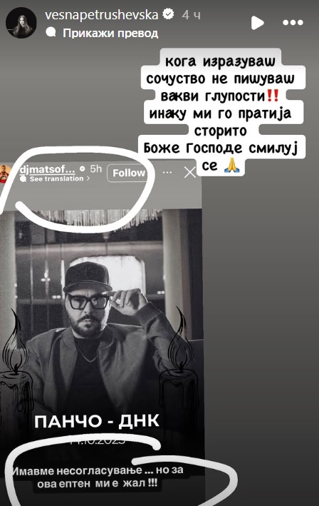 Оваа негова објава ја прекори актерката Весна Петрушевска која на својот инстаграм-профил напиша: „Кога изразуваш сочувство не пишуваш вакви глупости. Инаку, ми го пратија сторито, Боже Господе, смилуј се“, напиша Весна.
