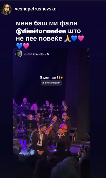 Весна Петрушевска сподели емотивна реченица за Димитар Андоновски, поп-пејачот од Битола. Ова се случи по концертот на Иван Босиљчиќ и Јелена Томашевиќ во Битола, кога Димитар запеал заедно со него.