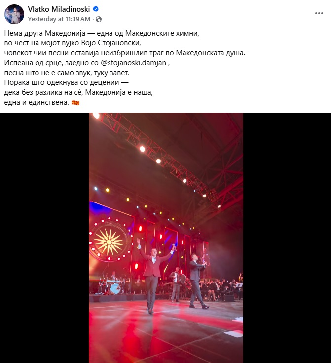 Испеана од срце, заедно со Дамјан Стојаноски, песна што не е само звук, туку завет. Порака што одекнува со децении- дека без разлика на сè, Македонија е наша, една и единствена- напиша пејачот на Фејбсук и сподели видео од неговиот настап заедно со братучед му Дамјан, синот на Војо.