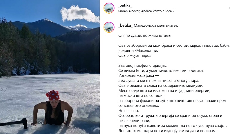 Сѐ е ок ама зоштио бикини, одвратна си. Оди дома прави ручек, кај одиш мори гола, ќе се каеш, памет во глава, болесничка- се дел од овие коментари. На социјалните мрежи, Бетика објасни што ја инспирирало да го објави ова видео во кое ги раскажува сите навреди.