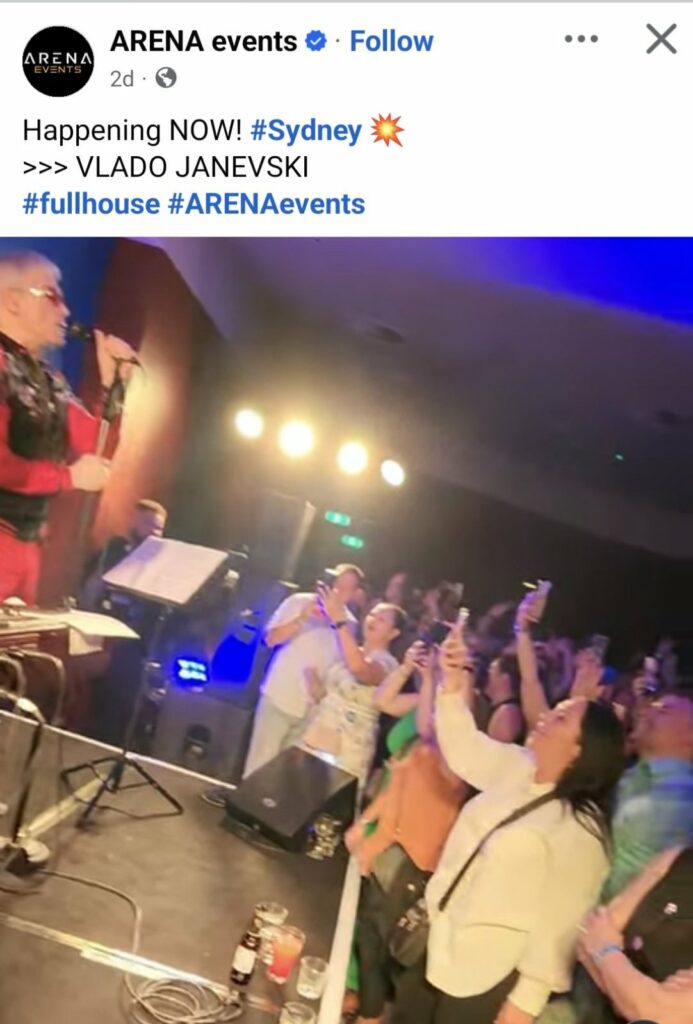 Вера е сега во Сиднеј, а токму во Сиднеј настапил Владо Јаневски изминатиов викенд. „Арена евентс“ објави видео од нашиот пејач како ја загрева атмосферата во клубот каде што настапил, а бил полн до последно место.