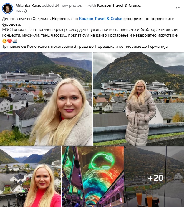 Првпат сум на вакво крстарење и неверојатно искуство е! Тргнавме од Копенхаген, посетуваме 3 града во Норвешка и ќе пловиме до Германија“, напиша Миланка Рашиќ, нашата позната новинарка, ескперт за Оскарите, за Евровизија и за танцот.