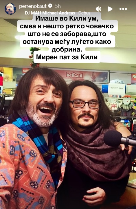 А Пере сподели и заедничка слика со Кили и до неа напиша: „Имаше во Кили ум, смеа и нешто ретко човечко што не се заборава, што останува меѓу луѓето како добрина. Мирен пат за Кили“, напиша музичарот.