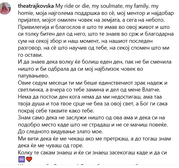 Колку те сакам знаеш и ќе си знаеш засекогаш каде и да си. Широко небо Владе мој. Тесно беше тука за тебe“, напиша Теа Трајковска.