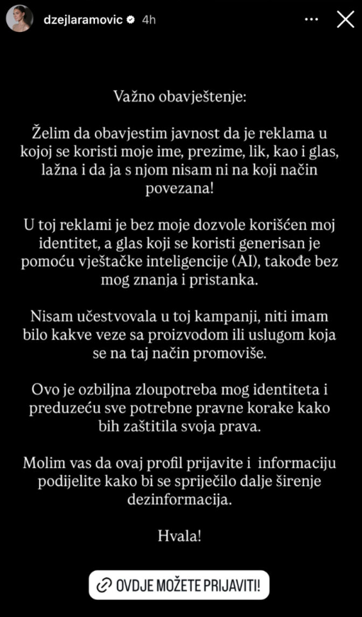 – Сакам да ја известам јавноста дека рекламата во која се користат моето име, презиме, лик и глас е лажна и дека јас не сум поврзана со неа на никаков начин! Во таа реклама, мојот идентитет е користен без моја дозвола, а гласот што се користи е генериран со помош на вештачка интелигенција (ВИ), исто така без мое знаење и согласност. Јас не учествував во таа кампања, ниту пак имам никаква врска со производот или услугата што се промовира на тој начин – рече Џејла.