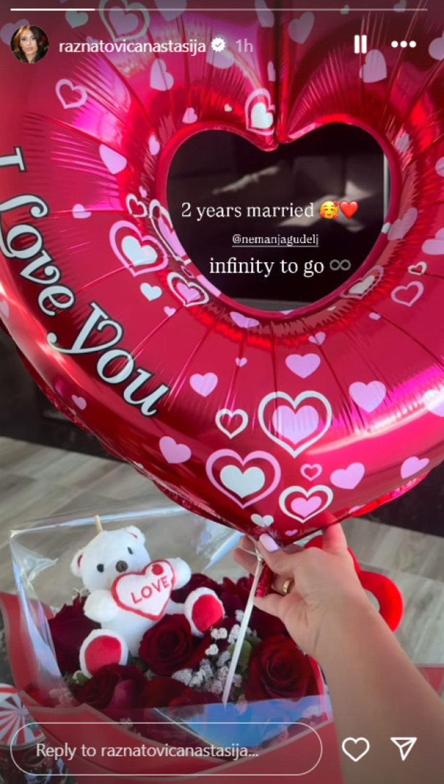 На својата Инстаграм приказна, Анастасија објави видео од подарокот што го добила од својот сопруг — балон во облик на срце со порака „Те сакам“, луксузен букет црвени рози и мече со натпис „Љубов“. Овој нежен гест не остана незабележан кај нејзините следбеници, кои го изразија своето воодушевување во коментарите и им честитаа на двојката за годишнината.