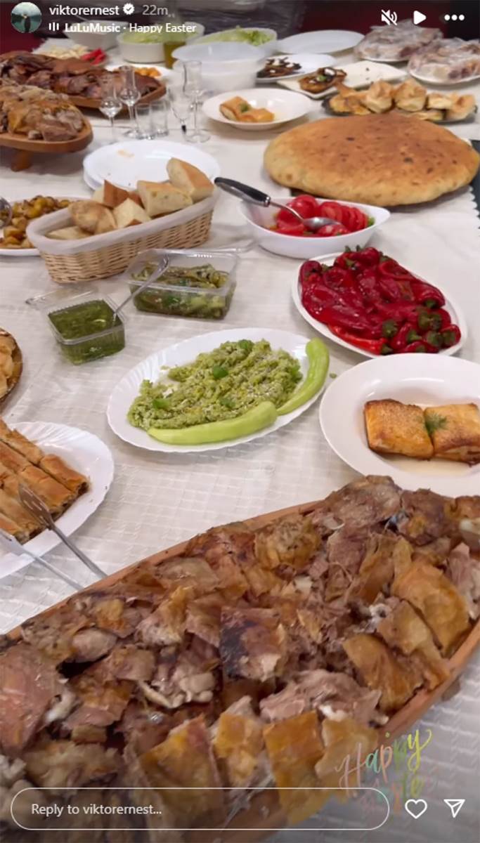 Семејството Живојиновиќ приредиле раскошна и богата гозба на која се наоѓало сè што сакаат – од печење, солени пити, колачи со вишни, разни салати, а сето тоа Виктор го сподели на својот инстаграм-профил.