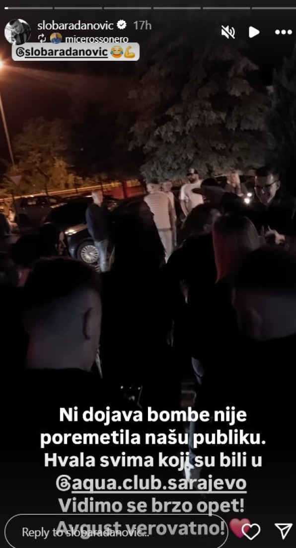 Информацијата за наводната бомба била лажна, а по оваа ситуација, Слоба сподели објава на Инстаграм во која вели дека „дури ни дојавата не ја вознемирила публиката“.