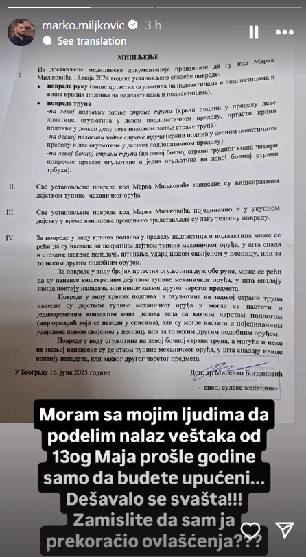 Поранешниот учесник во ријалити шоу и јутјубер Марко Миљковиќ беше приведен минатата година по расправија со својот сосед, а сега проговори за тоа. Марко го сподели на својот Инстаграм вештачењето од мај минатата година, во кое се наведува дека има повреди на надлактицата и градите.