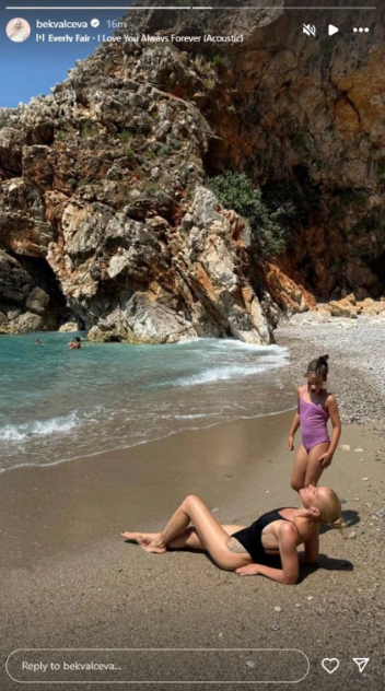 Наташа и Катја беа во едноделни костими за капење, а се чини дека сè им е идилично покрај морето. На фотографијата гледаме плажа од соништата, Катја која не се одвојува од својата мајка и идеалното време.