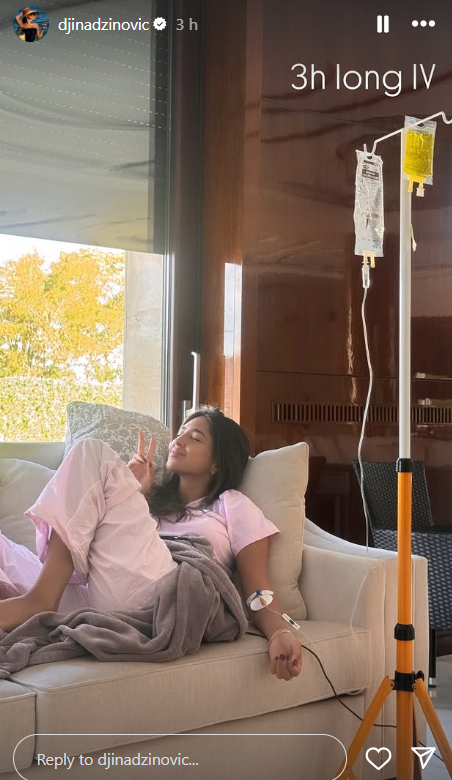 На својот Инстаграм, Ѓина објави фотографија од семејната вила, каде што се сликала додека лежела исцрпенат и примала инфузија.