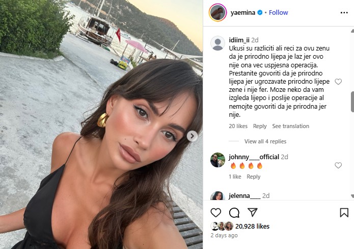 „Вкусовите се различни, но да се каже за оваа жена дека е природно убава е лага, бидејќи ова не е таа, туку успешна операција, престанете да велите дека е природно убава затоа што ги загрозувате природно убавите жени и тоа не е фер“, „Време е луѓето да станат реални и да не дозволат лажниот Инста свет да владее“, се некои од пораките што може да се најдат под оваа објава на Емина.