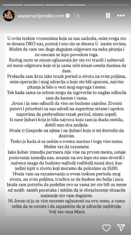 „Драги мои новинари, слободно можам да кажам соработници, а секако и пријатели. Во овие тешки времиња, покрај сè што се случува околу нас, се случува и она што се случува во нашите срца. Мислам дека одамна ви должам одговори на некои прашања и не се чувствувам добро поради тоа. Причината зошто не проговорив е затоа што сите вие баравте и баравте одговори од мене што не знаев како да си ги дадам. Поминував низ многу тежок период во мојот живот во сите области, освен за операцијата и моето здравје за кои бевте информирани, најмногу прашања беа за мене и мојот сопруг. Дури кога можев да си го кажам тоа гласно, решив да ви кажам и на вас. Јован и јас решивме повеќе да не бидеме заедно. Животните патишта и приоритетите нè одведоа на спротивставени страни и покрај нашите напори да го надминеме тешкиот период, не успеавме. Од нашата љубов, која беше најголемата што некогаш сум ја почувствувала, добивме два ангела. Ти благодарам, Господе, за нив и за љубовта што ми дозволи да ја доживеам. Тешко е кога си со некого со кого се си сонувал, тој повеќе го нема. Ве молам да разберете. Иако љубовта меѓу партнерите повеќе не е на прво место, останува почитта меѓу нас, сеќавањето на сите убави работи што сме ги создале и најголемата сила да бидеме најдобри родители на нашите деца, како единствен испит во животот што треба да го положиме со оценка 10.00. Ви благодарам за разбирањето во овој тежок период од мојот живот, на сите полиња, ќе се обидам да бидам што е можно подобра и посилна. Почувствував потреба да го споделам ова со вас бидејќи бевте со мене од самиот почеток и мислам дека објаснувањето на ситуацијата е најмалку што ви должам. Ниту Јован ниту јас повеќе нема да коментираме на оваа тема, а сакам да се грижите за себе и да запомните дека здравјето е најважно“, рече пејачката.