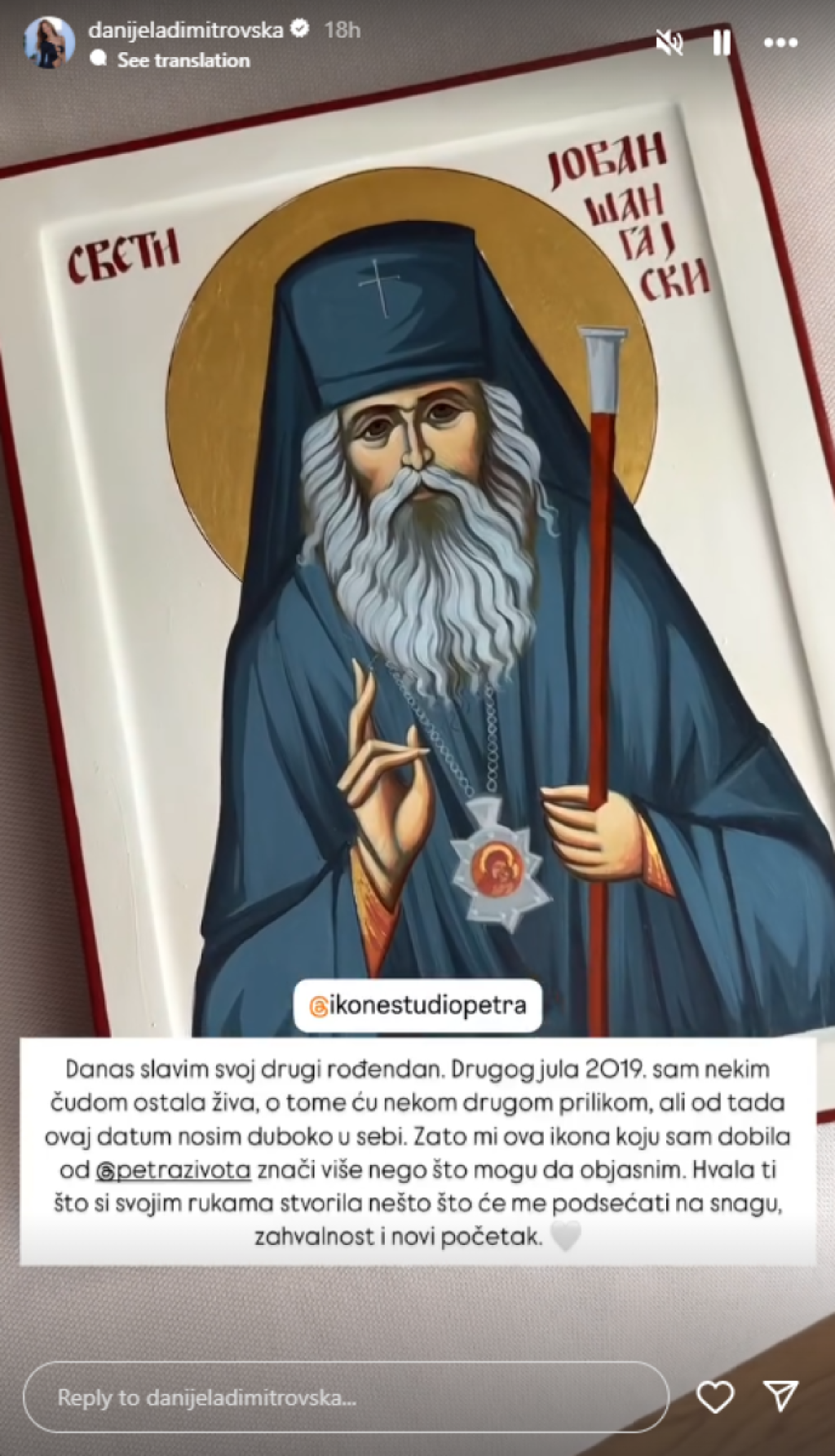 „Денес го славам мојот втор роденден. На втори јули 2019 година, чудесно преживеав, за тоа ќе зборувам друг пат, но оттогаш го носам овој датум длабоко во себе. Затоа оваа икона што ја добив од Петра ми значи повеќе отколку што можам да објаснам. Ви благодарам што создадовте нешто со вашите раце што ќе ме потсетува на сила, благодарност и нов почеток“, напиша водителката на Инстаграм.