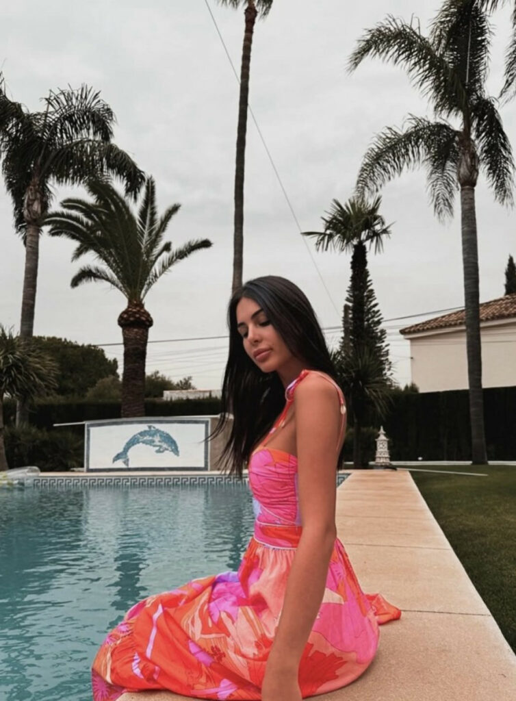 На фотографијата што ја објави на социјалните мрежи, во преден план се нејзините голи нозе, постелнината и спектакуларниот поглед кон палмите и базенот во дворот. Спалната соба е со стаклен ѕид, што дава чувство на отвореност и луксуз.