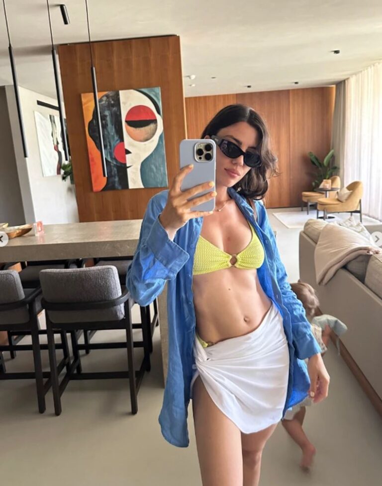 Ивана се фотографирала во својот мрежест фустан за плажа, а потоа и во костим за капење, додека во позадина се гледал нивниот син Василије како трча низ просторот во кој се сместени.
