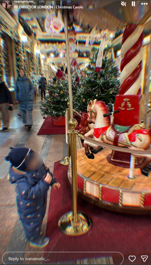 На фотографијата момчето е во топла зимска јакна и капа, целосно воодушевено пред раскошно украсена новогодишна вртелешка. Опкружен со елки, светла и празнични украси, малиот стои целосно воодушевен како да влегол во вистински божиќен филм.
