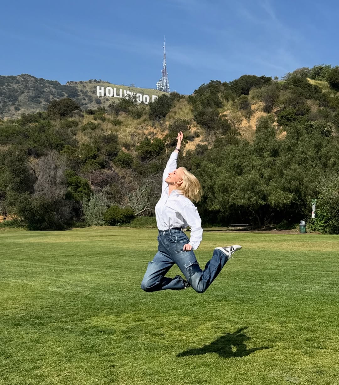 На тревникот во паркот Лејк Холивуд, со поглед на ридовите над градот, таа позирала во скок и така го фатила својот „холивудски момент“, со опуштена комбинација од бела кошула, фармерки и патики.