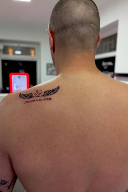 Тој му посвети тетоважа на рамото на покојниот Драган, на која гледаме црни крилја и неговите иницијали, како и ореол погоре и датумот на раѓање и смрт.