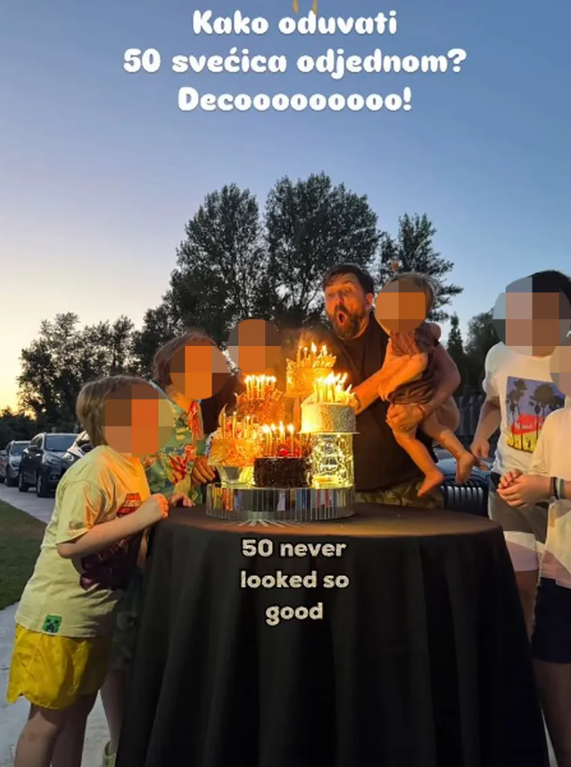 Посебно внимание привлече огромна торта со дури пет ката, од кои секој беше во различна боја. Освен неа, пристигна и дополнителна чоколадна торта со свеќички за роденден, а декорацијата се состоеше од балони во форма на бројот 50, очилата на славеникот и вистински огномет што го осветлуваа небото.