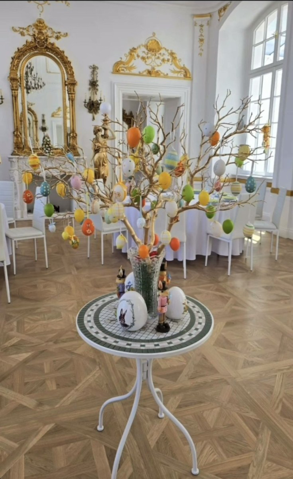 Сепак, она што веднаш паѓа во очи е колку внимание таа посветила на велигденското украсување. Централниот дел на една просторија е украсен со златни гранки во вазна, покриени со разнобојни јајца и фигури на зајаци. Масите се поставени со вкус, но веселите тонови на украсите му даваат на целиот простор разиграна нота.