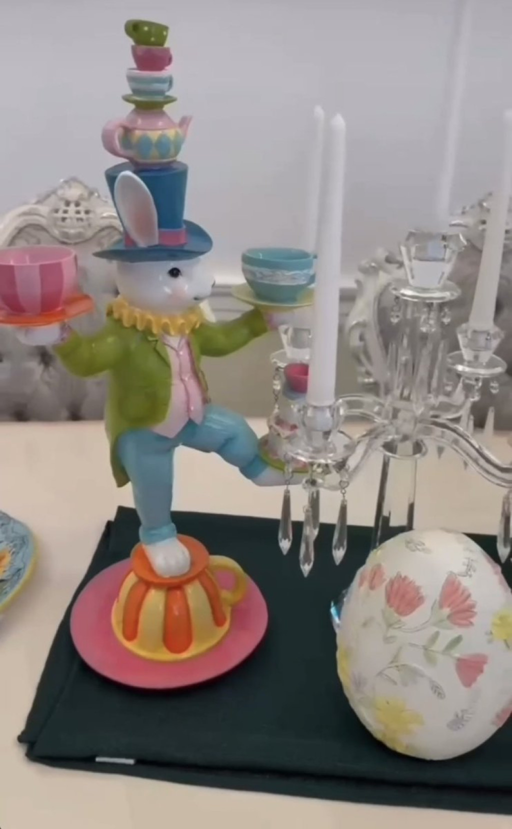 Посебно е интересен детаљот во форма на зајаче облечено во шарена облека, со шолји за чај кои се балансираат на шепите и главата. Има и украсни свеќи, јајца со цветни мотиви и мали фигурини кои потсетуваат на традиционалните европски велигденски саеми.