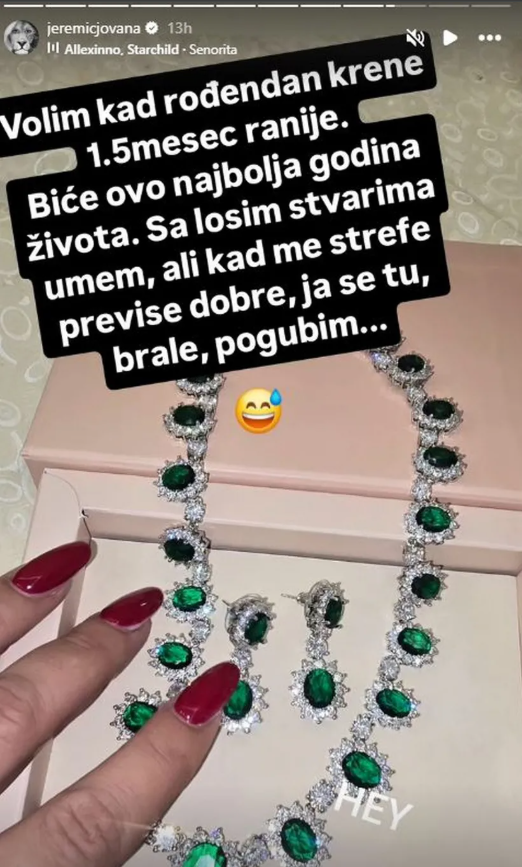 На Инстаграм, таа сподели фотографија од прекрасен, скап сет обетки и ѓердан со смарагдни камења, што ги натера многумина да помислат дека пронашла партнер кој е „возбуден“ и едвај чека да го дочека нејзиниот роденден.