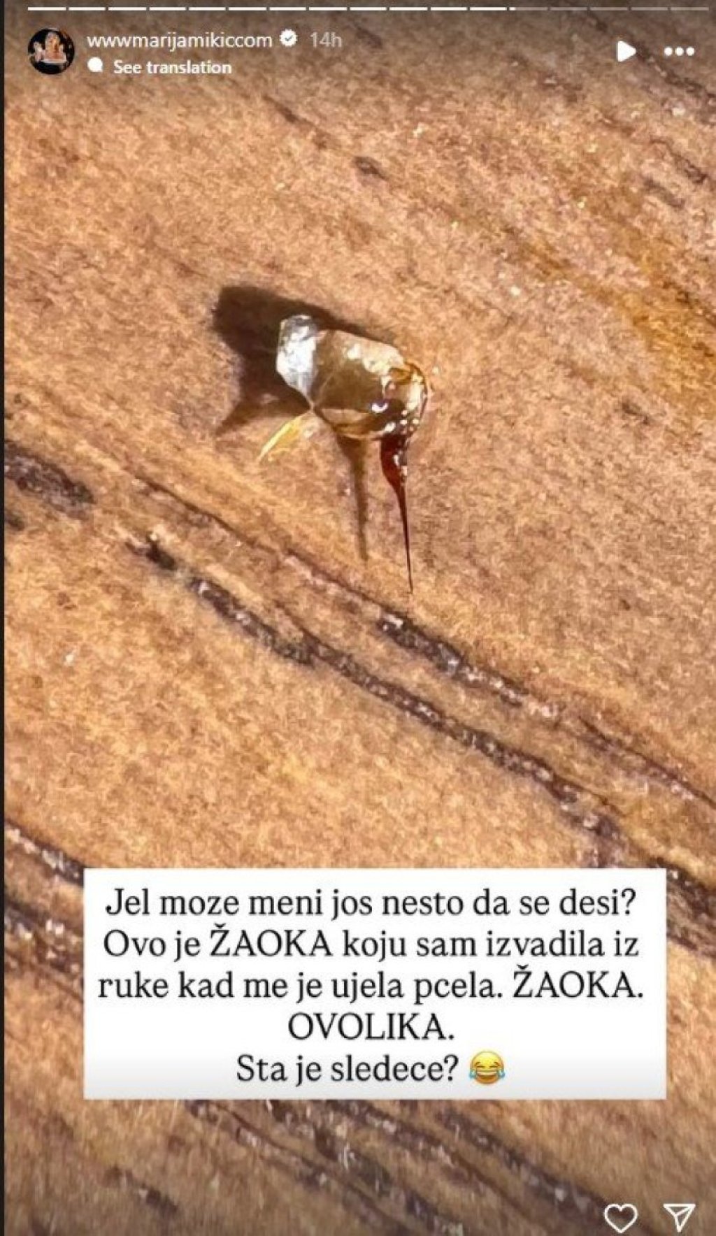 „Може ли да ми се случи нешто друго? Ова е убодот што го извадив од рака кога ме касна пчела. Убод толку голем. Што е следно?“ напишала Марија и објавила фотографија од убодот.